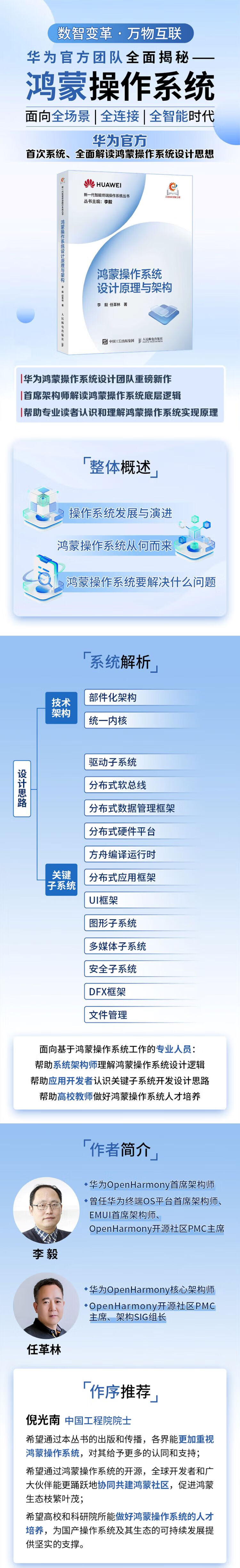 1.内容可靠,整理自华为官方文档。 2.作者来自鸿蒙开发者团队,openHarmony首席架构师李毅,openHarmony社区PMC主席任革林领衔创作团队。 3.内容设置合理,涵盖鸿蒙系统的全部重要特性,详略得当。 4.详细分析鸿蒙操作系统设计原理与架构。